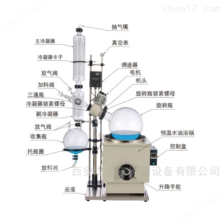 旋转蒸发仪工作原理 蒸发瓶恒速旋转,水浴锅恒温加热,在此条件下:物料在蒸发瓶内壁形成大面积均匀薄膜快速蒸发,在真空条件下可以提高蒸发效率(需连接真空装置),溶媒蒸汽经玻璃冷凝盘管时冷却成液体(需连接冷却装置),回收于收集瓶。本系列产品使用需配套真空装置(循环水式、旋片式、隔膜式等真空泵),冷却循环装置组成系统装置。 基本配置 与物料接触部分全部采用高硼硅玻璃(膨胀系数3.3)和聚四氟乙烯材料,性能稳定不易与料起化学反应。 主体支架采用冷板防腐喷塑+铝合金材质,锅胆采用不锈钢材质。 密封系统采用聚四氟乙烯+氟橡胶复式组合密封。 真空压力表显示实时真空,指针显示。 活塞式加料阀套接聚四氟乙烯加长管,可在真空状态下连续进料蒸发瓶。 一体式冷凝器,直立双层蛇形盘管。 变频调速,防爆开关,通过旋扭微调,转速数显。 恒温浴锅温度数显,锅底K型传感器+不锈钢探棒。 浴锅手轮升降。旋转、加热双熔断器保护。旋转蒸发仪 |